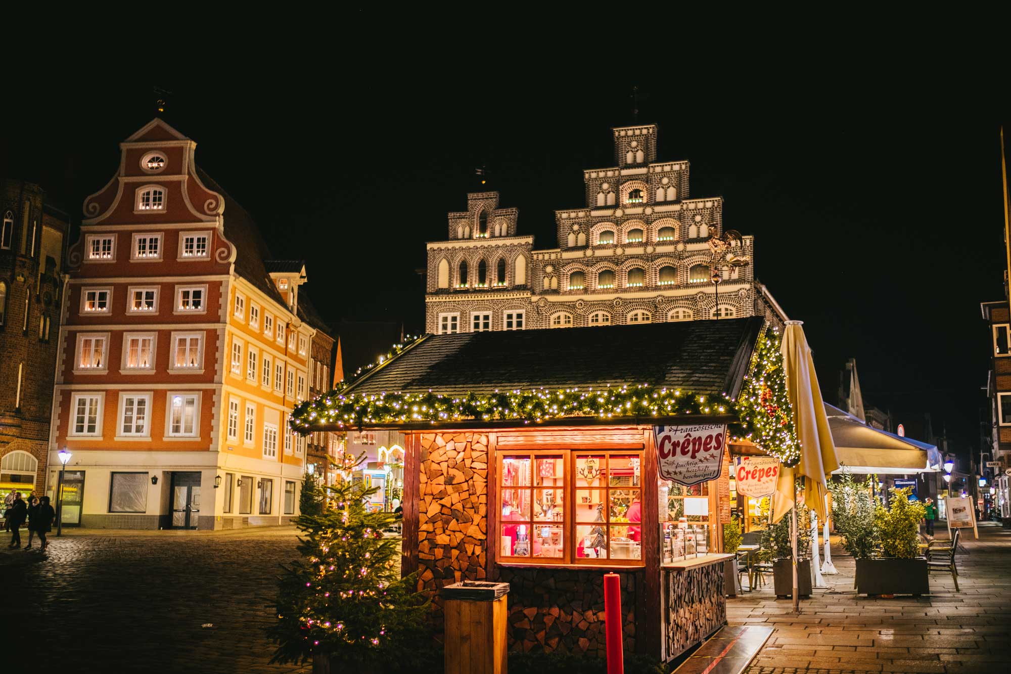 Zu Füßen des Alten Rathauses am Marktplatz liegt der schöne Weihnachtsmarkt der Stadt Lüneburg. Festliche Stimmung mit weihnachtlichem Glühwein- und Lebkuchenduft ist hier im Norden bei dieser Kulisse garantiert. Kinder können eine Runde mit der Eisenbahn oder dem Karussell drehen. Ein weiteres Highlight ist der Trompeter, der täglich um 16:45 Uhr auf dem Rathaus-Balkon weihnachtliche Lieder spielt. In der Innenstadt gibt es eine kleine Märchenmeile: 12 Häuschen mit bekannten Märchenfiguren sind in der Innenstadt verteilt und erzählen ihre Geschichte. Außerdem lohnt es sich den historischen Christkindmarkt (06.-07.12.) zu besuchen. Traditionelle Trachten und altes Handwerk laden am ersten Dezemberwochenende auf eine Zeitreise zurück ins Mittelalter ein.