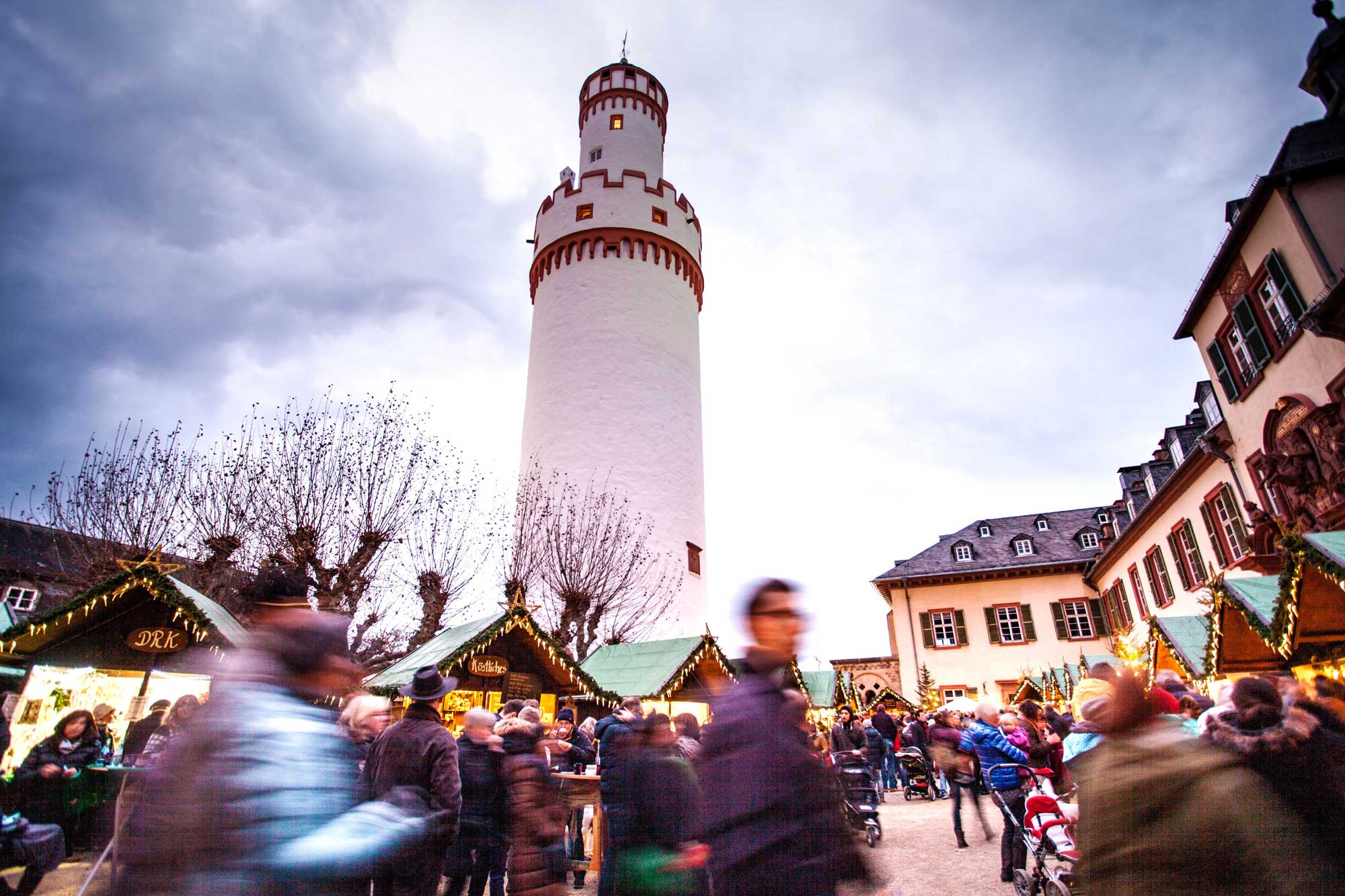 Im Hof des Landgrafenschlosses finden Weihnachtsmarktbesucher:innen alles, was das Herz begehrt: Leckereien aus der Weihnachtsbäckerei und regionales Kunsthandwerk. Für Kinder steht ein Kinderkarussell bereit und eine echte kleine Dampfeisenbahn dreht ihre Runden um den Weißen Turm, das Wahrzeichen der Weihnachtsstadt Bad Homburg.