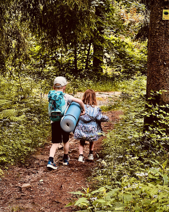 Es sind etwa 3,1 Kilometer bis zum Trekkingplatz „Abgetaucht“, einer der abgelegensten Plätze der Nordeifel. Drei Kilometer wandern mit einer Vierjährigen und einem Sechsjährigen? Eine Herausforderung. Noch dazu, wenn Regen droht. Trotzdem laufen die Kinder tapfer mit, jeder Schritt wird von ihrem neugierigen Geplapper begleitet und von dem einen oder anderen, oder anderen, oder anderen, oder anderen Stopp an einem großen Ast, einem Stein, einem Käfer oder einer Kreuzung. Geduldig trage ich den größten Teil des Gepäcks, während die beiden jeweils kleine Rucksäcke mit Proviant auf dem Rücken haben. Meine Schultern ächzen, meine Arme schmerzen. Wieso haben wir so viel dabei?