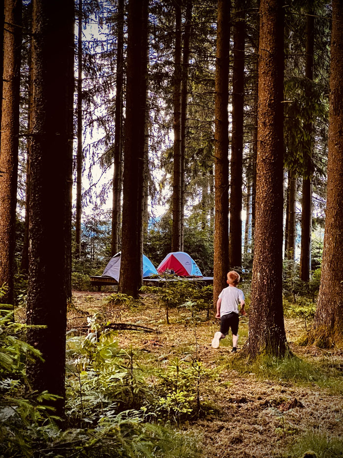 Doch als wir ankommen, ist alles vergessen. Ein kleiner Pfad führt die letzten Meter zur Holzplattform im Wald. Die Kids rennen und toben umher und sind ganz aufgeregt, die Zelte aufzubauen. Zu unserem Glück ist es noch immer trocken und wir schaffen es, die beiden Stoffhöhlen schnell aufzustellen. Die Plattform liegt mitten im Fichtennwald, umgeben von moosigem Boden und dichtwachsendem Grün – ein richtig schöner Platz. In einigen Metern Entfernung befindet sich ein hölzernes "stilles Örtchen" mit einer Komposttoilette darin. Dann beginnt das kleine Wunder: Der Himmel klart auf, ein Lichtstrahl fällt durch die Baumkronen und erleuchtet den Trekkingplatz in romantischem Abendrot. Die Kinder sind begeistert, für einen Moment wirkt alles magisch.
